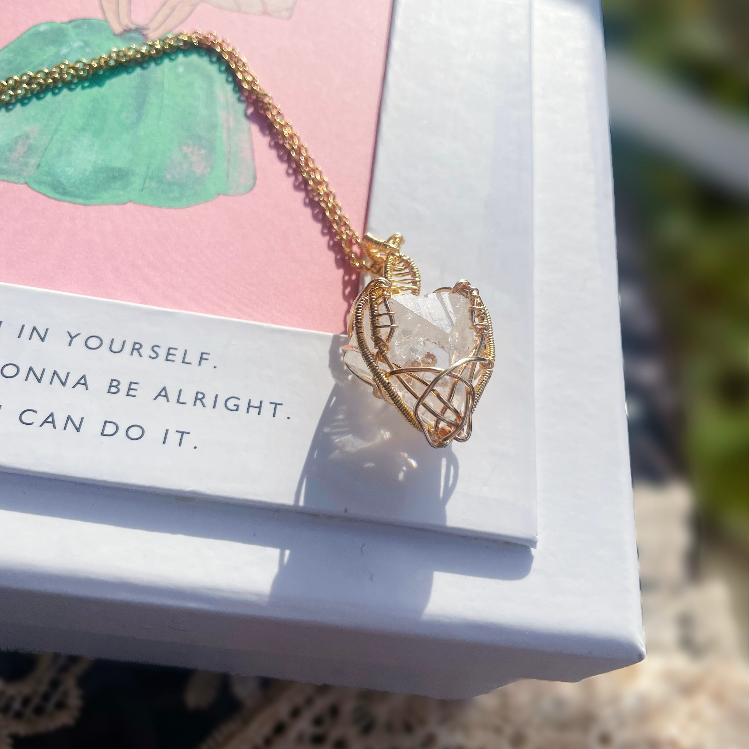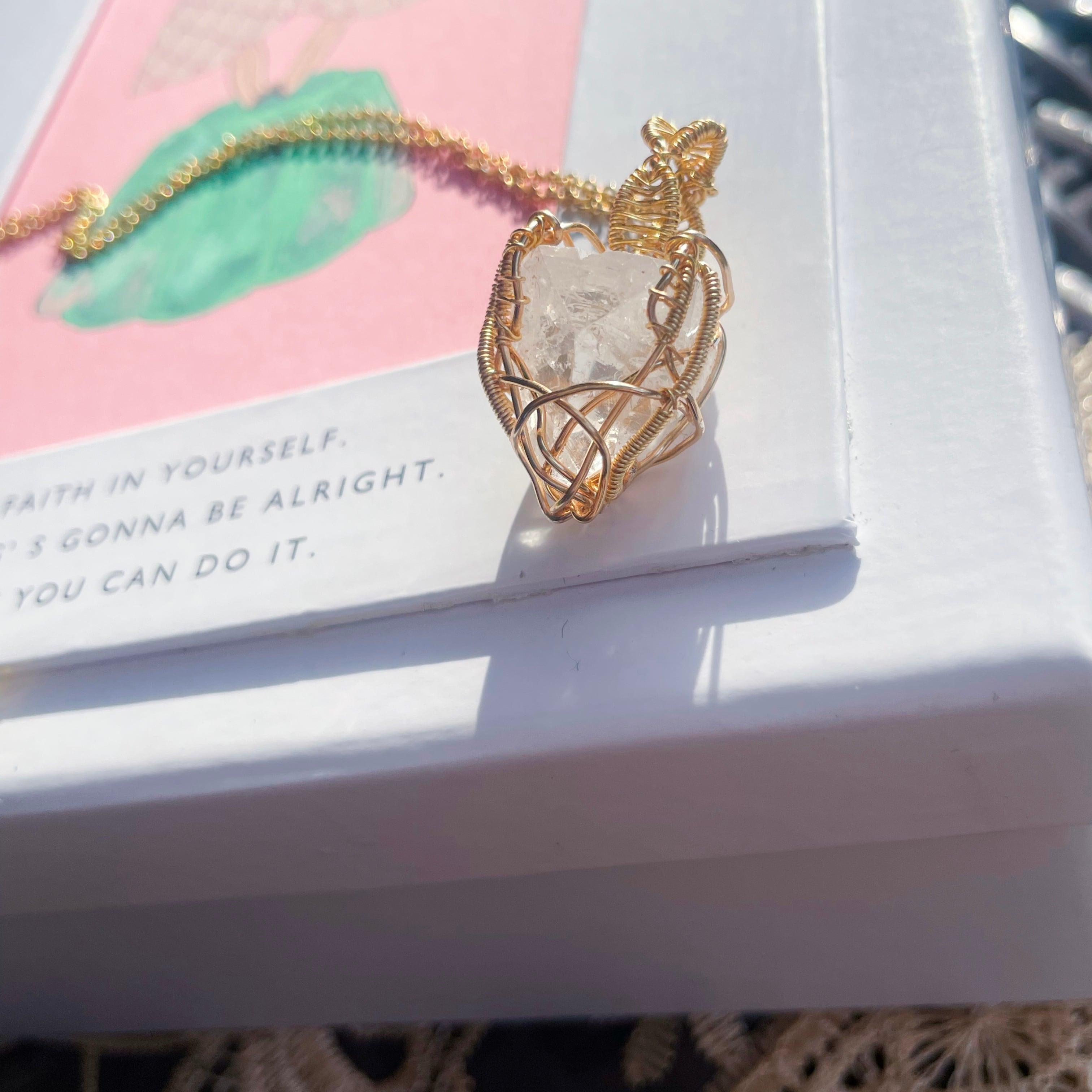 清らかな光をそのまま結んだような、クリアなアポフィライトを上品なワイヤーワークで包みました。樹齢二千年の大楠で知られる来宮神社のお宮をイメージし、「凛とした清め」と「優しい安心感」を一粒に。