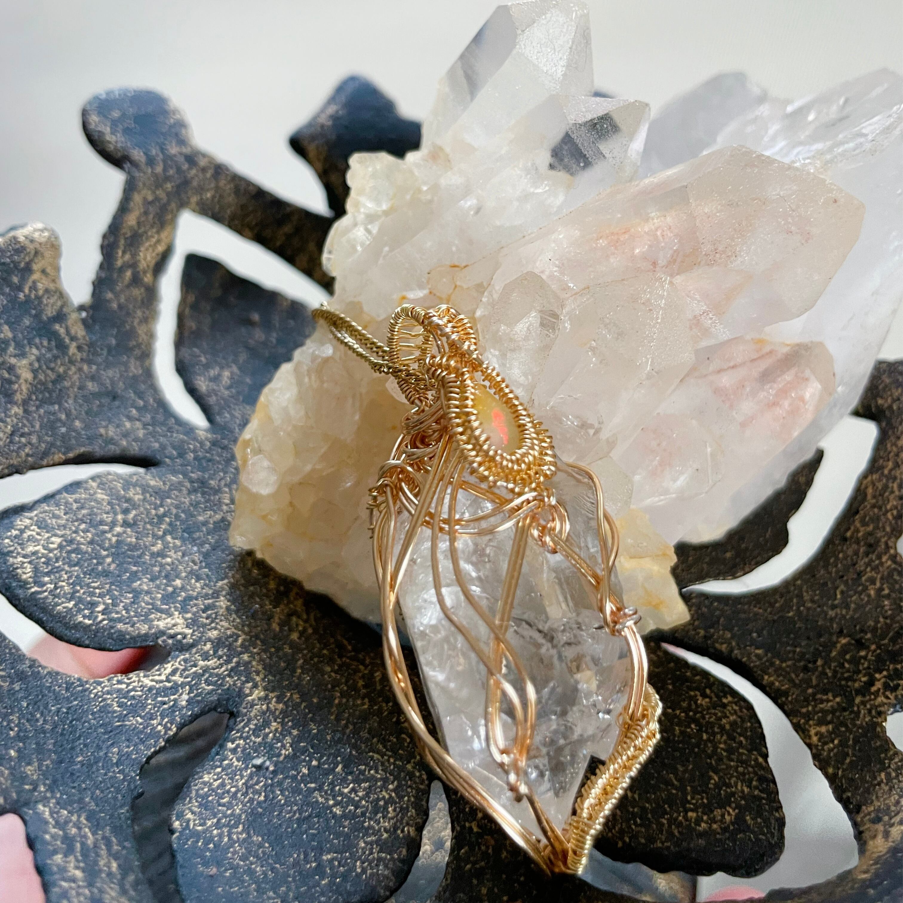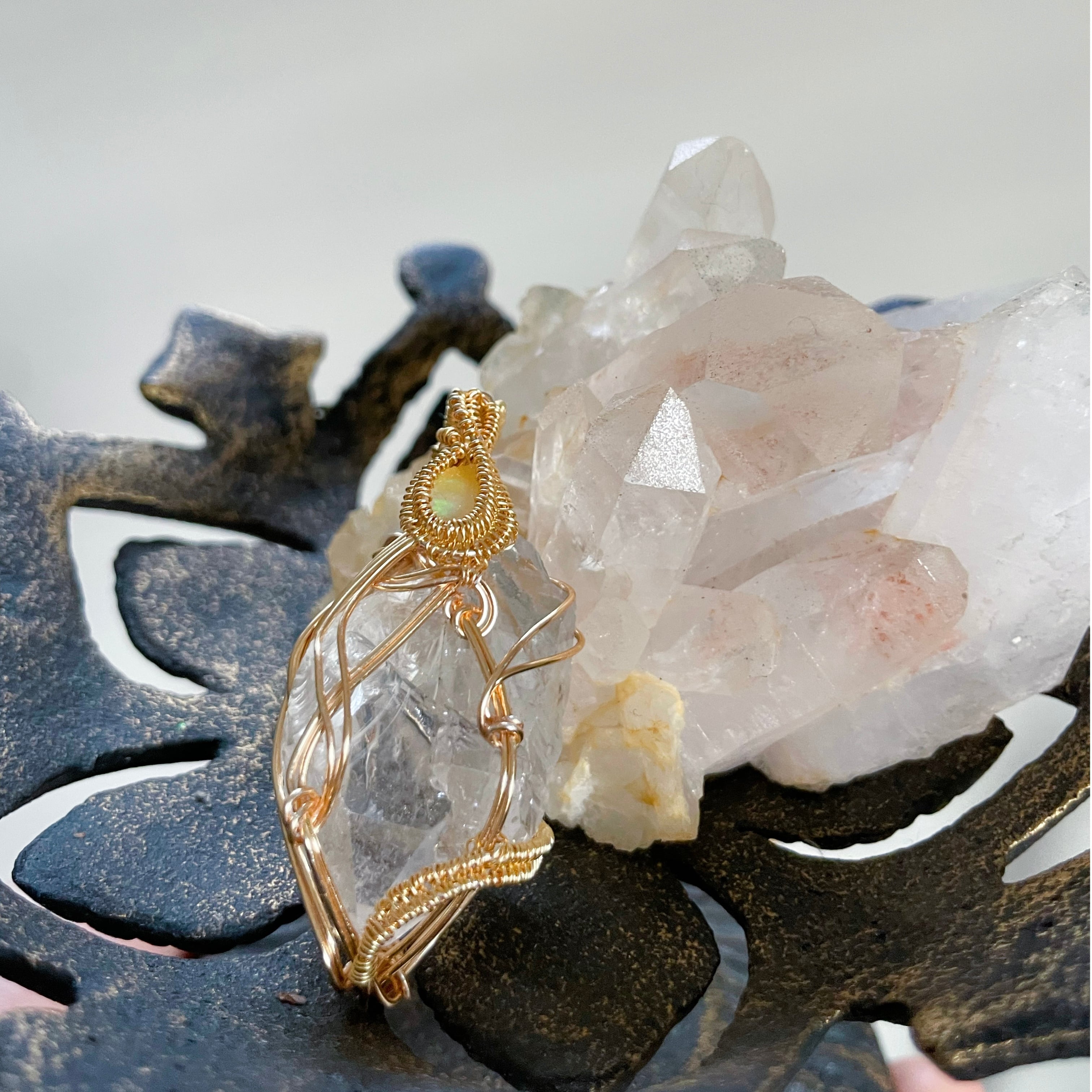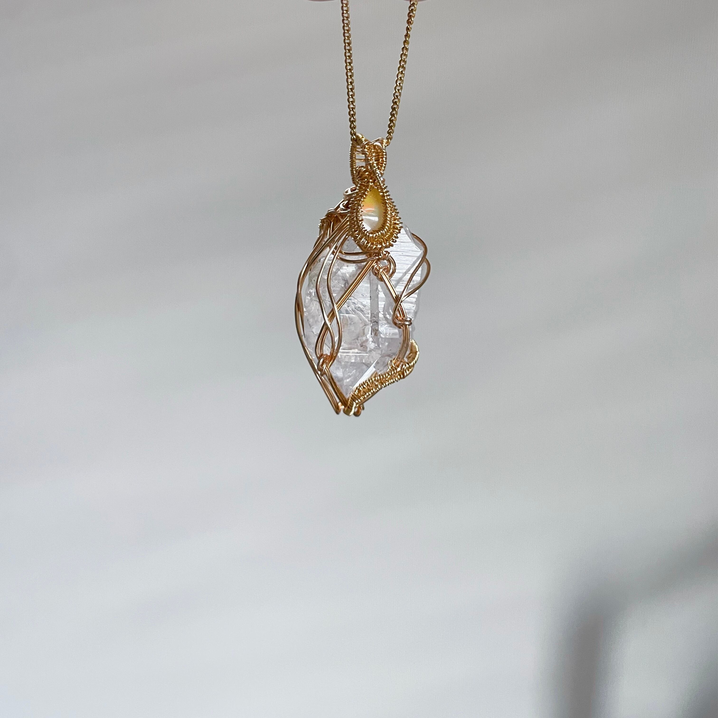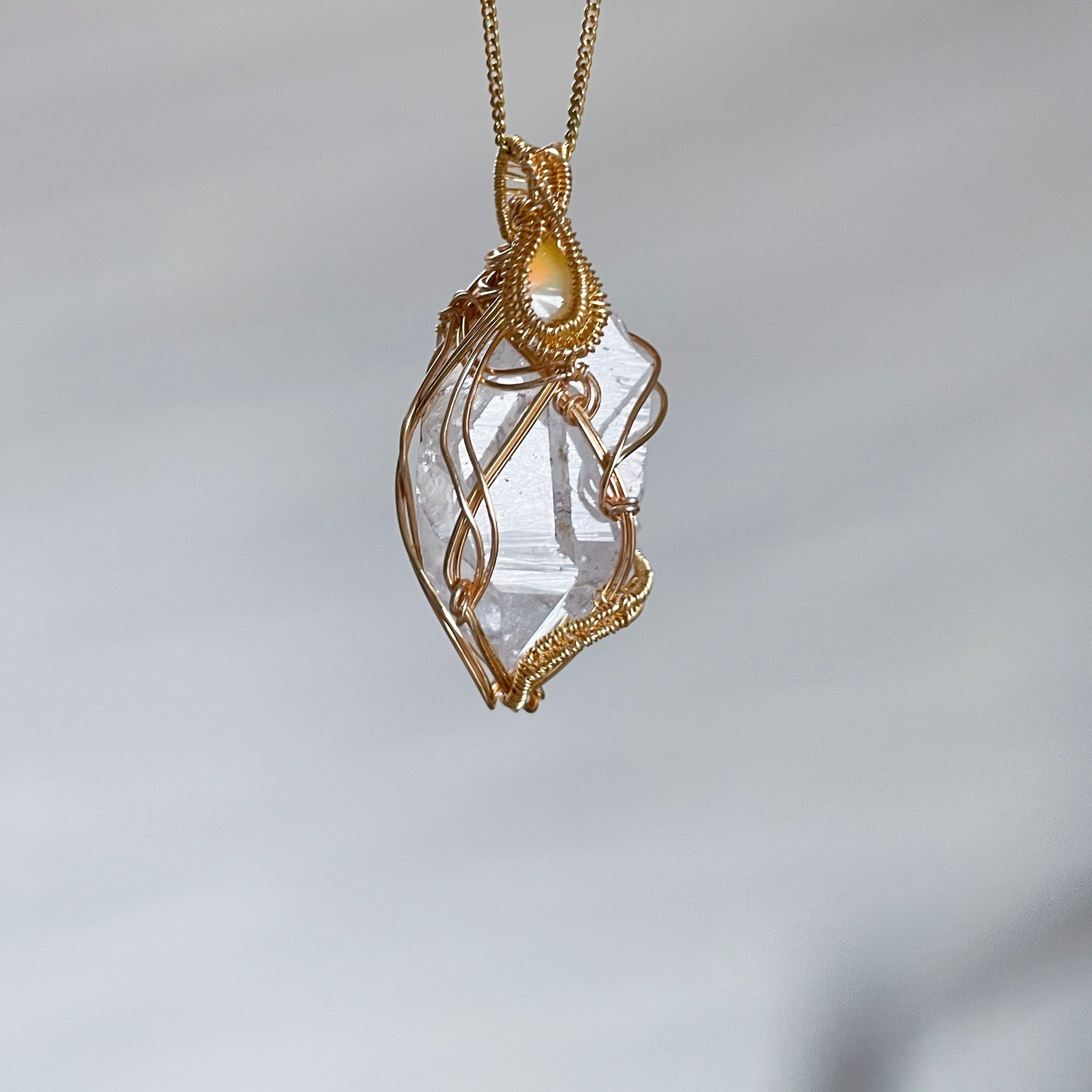 澄みきったヒマラヤ水晶を、繊細なゴールドワイヤーで包み込み、トップに温かな輝きを放つオパールを添えたネックレス。山々の清浄な気を宿す原石の表情と、光の角度で表情を変えるオパールのきらめきが、身に着ける人の個性と内なる感性を美しく引き立てます。